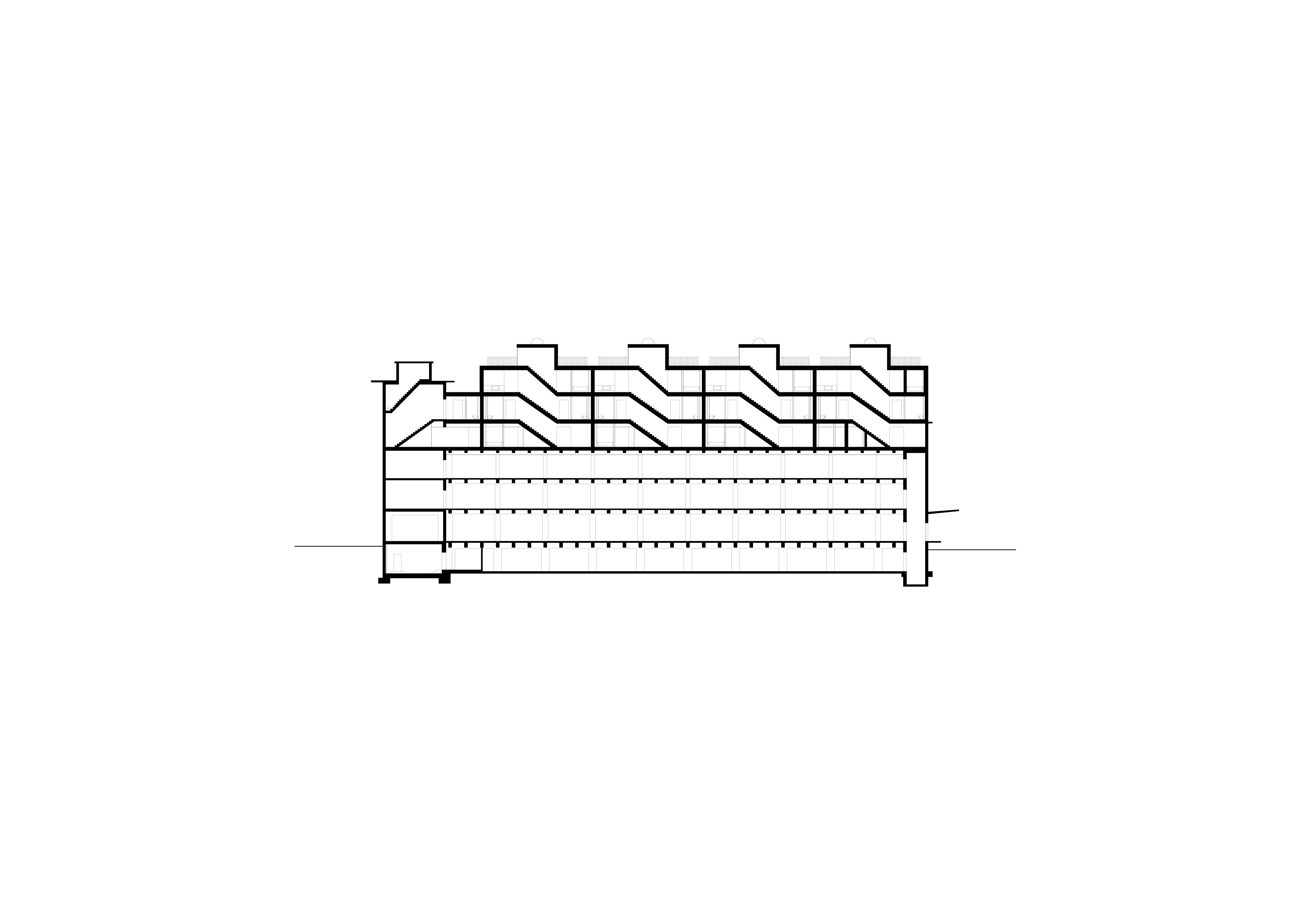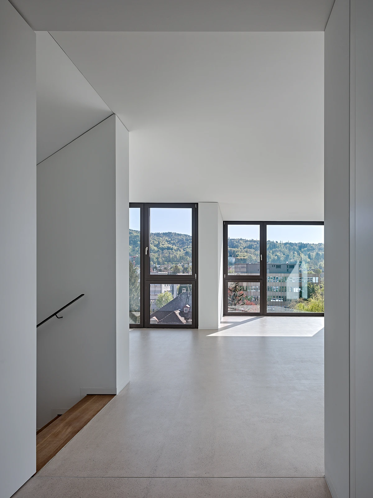 Obwohl die Struktur der Aufstockung auf den ersten Blick einfach und klar erscheint, sind die einzelnen Duplex-Wohnungen komplex ineinander verschachtelt. Dies bewirkt neben der räumlichen Variation der zwei Grundtypen auch die erforderliche Ausrichtung der 17 Wohneinheiten zur lärmabgewandten Gebäuderückseite. Die grosszügigen Wohn- oder Schlafräume finden in vorgelagerten Aussenterrassen ihre Fortsetzung. Die Vertikalstapelung erzeugt im Innern die Weite eines kleinen Stadthauses: Der räumlich gefasste innere Treppenlauf führt je nach Wohnungstyp ein Geschoss hinunter: in die umgenutzte Gebäudestruktur des dritten Obergeschosses; oder hoch: in das aufgestapelte fünfte Obergeschoss. Sämtliche Einheiten werden im vierten Obergeschoss über einen einzigen inneren Korridor, eine Rue Intérieure, erschlossen. Diese wird über als vertikale Schächte ausgebildete Lichtkanonen zenital belichtet. Der Ausdruck der Fassade ist städtisch und Abbild der inneren Organisation. Die gewählte Verkleidung der hölzernen Aufstockung, detailarme Faserzementgusselemente, ist langlebig und schlägt den Bogen zurück zum massiven Grundbau.
