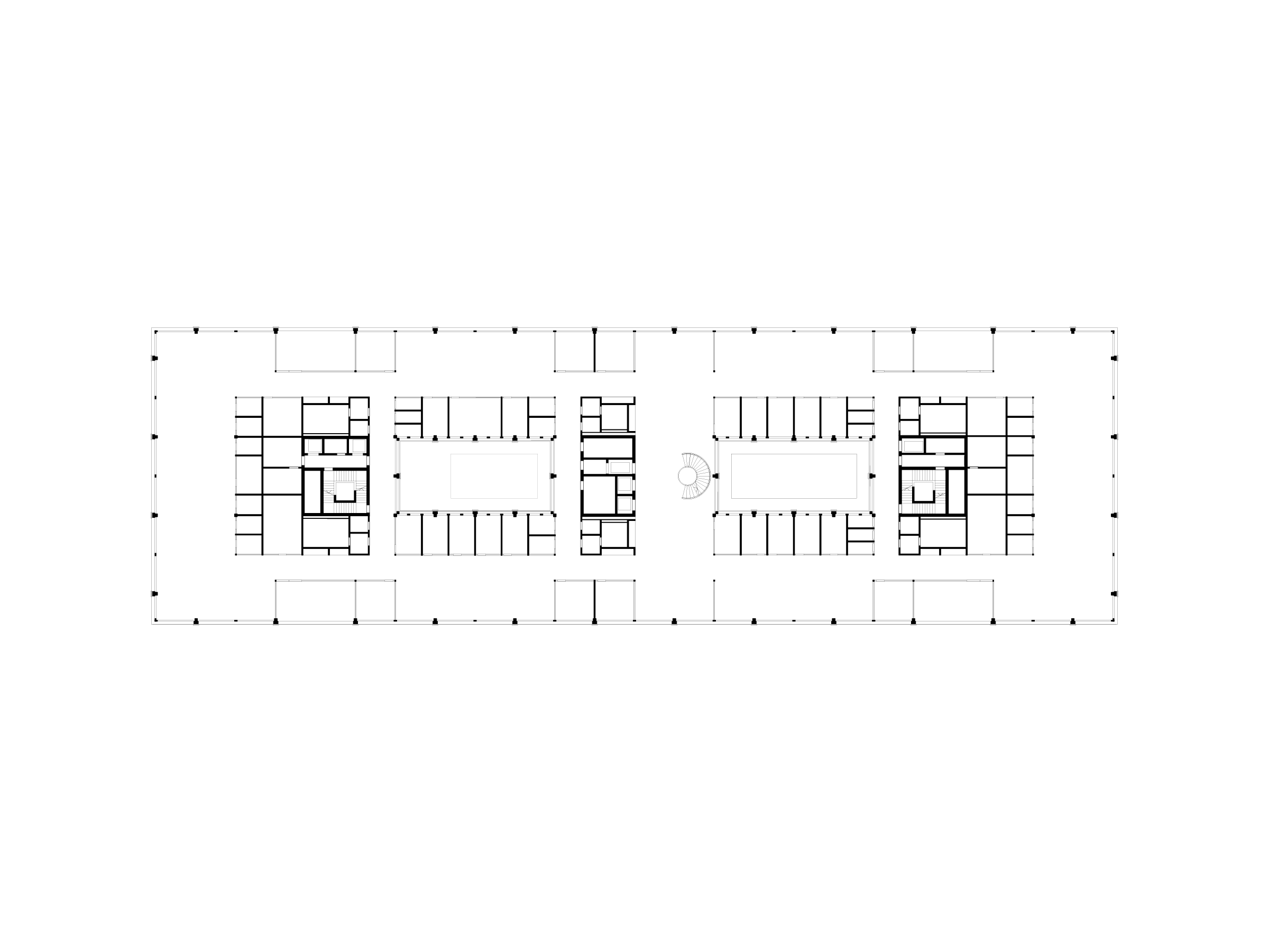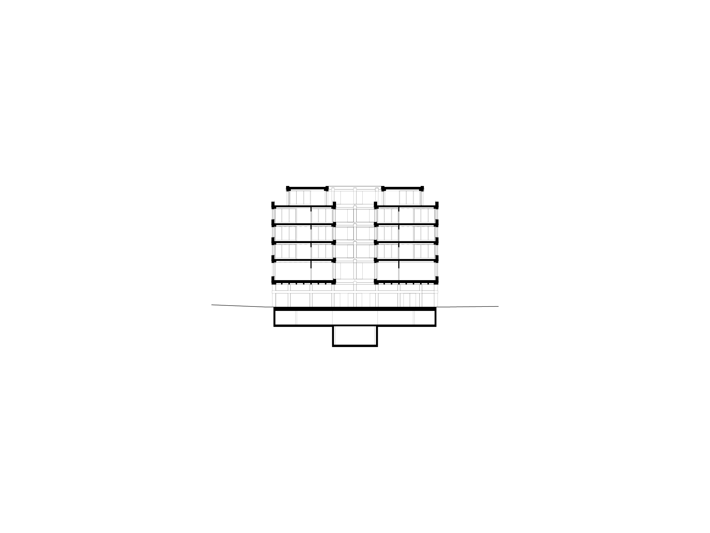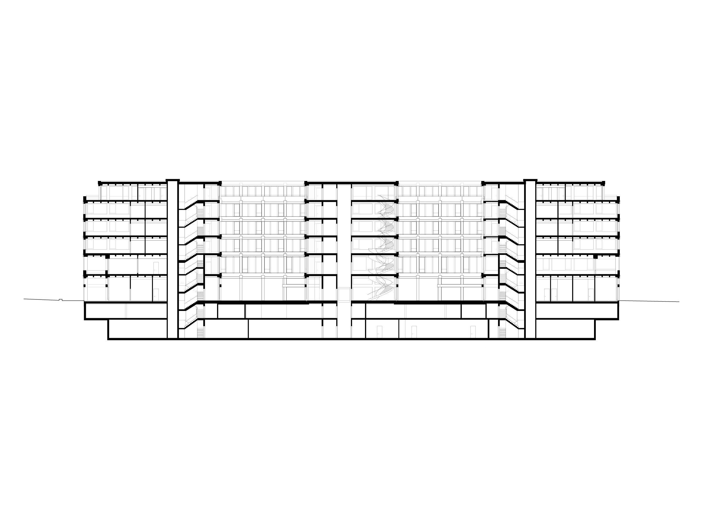 The proposed building comprises a ground floor with high ceilings, a mezzanine, three typical floors, and an attic. Its generously proportioned, tectonically joined, and robust façade with an industrial aesthetic is structured with loggias on its longer side, determining the expression of this visually condensed urban building block. A highly efficient structurally load-bearing system of beams and ribs characterizes the ceilings inside. Centrally arranged, a generous spiral staircase connects the floors, providing attractive views into the courtyard.