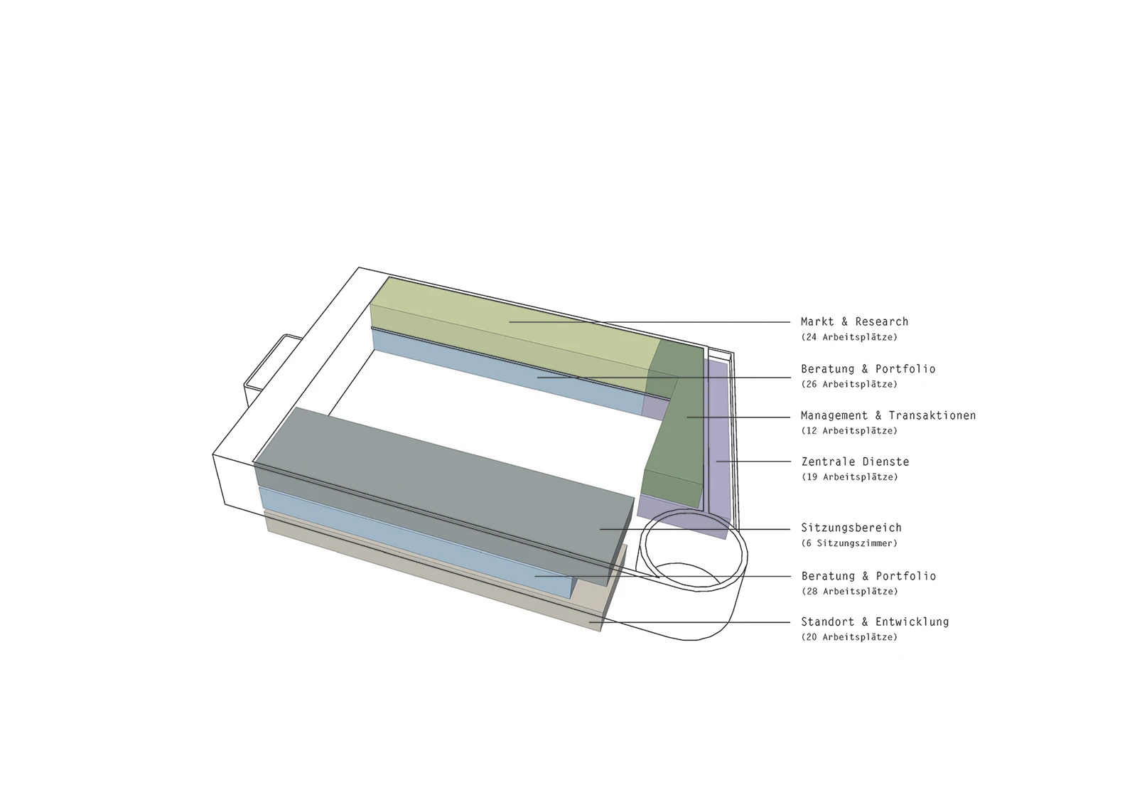 spillmann echsle’s design for the new headquarters of Wüest & Partner expands the spatial concept of 'ring within a ring'. This reference to the site’s origins creates a link between the historical past and its future usage by an international company.
